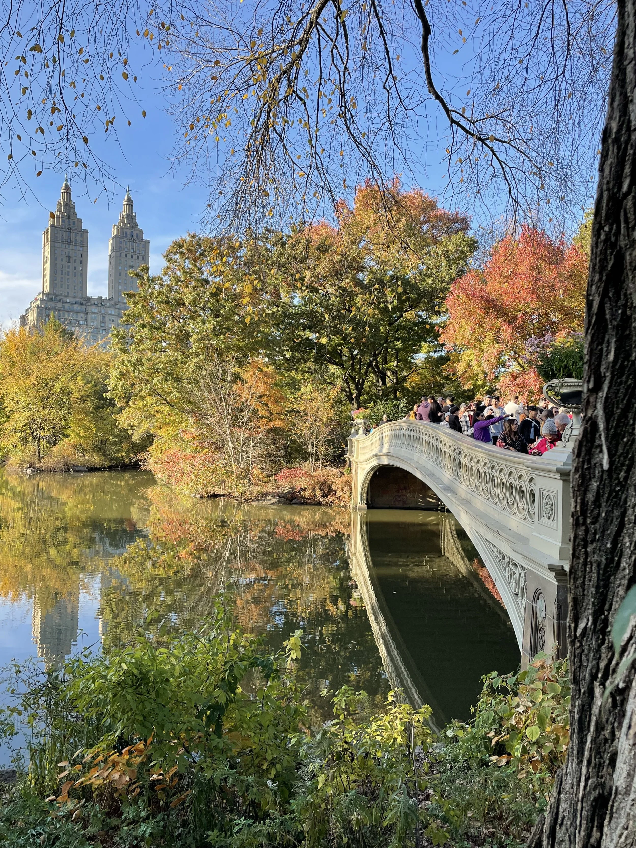October 30th, 2022: Peak foliage flourishes and tourists gather at beautiful Bow Bridge in serene Central Park.